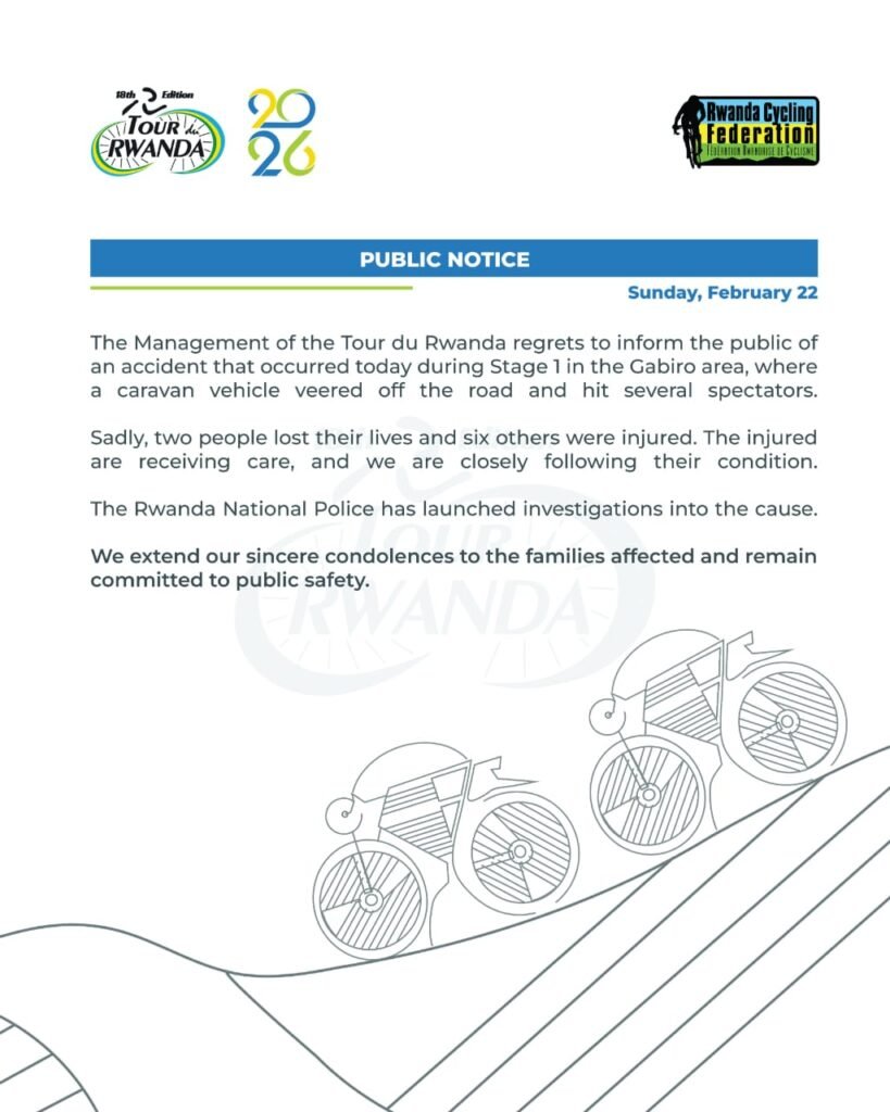 Selon un communiqué de la Rwanda Cycling Federation, le bilan provisoire fait état de deux morts et de six blessés. Les personnes touchées ont été immédiatement prises en charge par les équipes médicales présentes sur le dispositif de sécurité, puis transférées vers des structures de santé pour des soins appropriés. Leur état fait l’objet d’un suivi attentif.