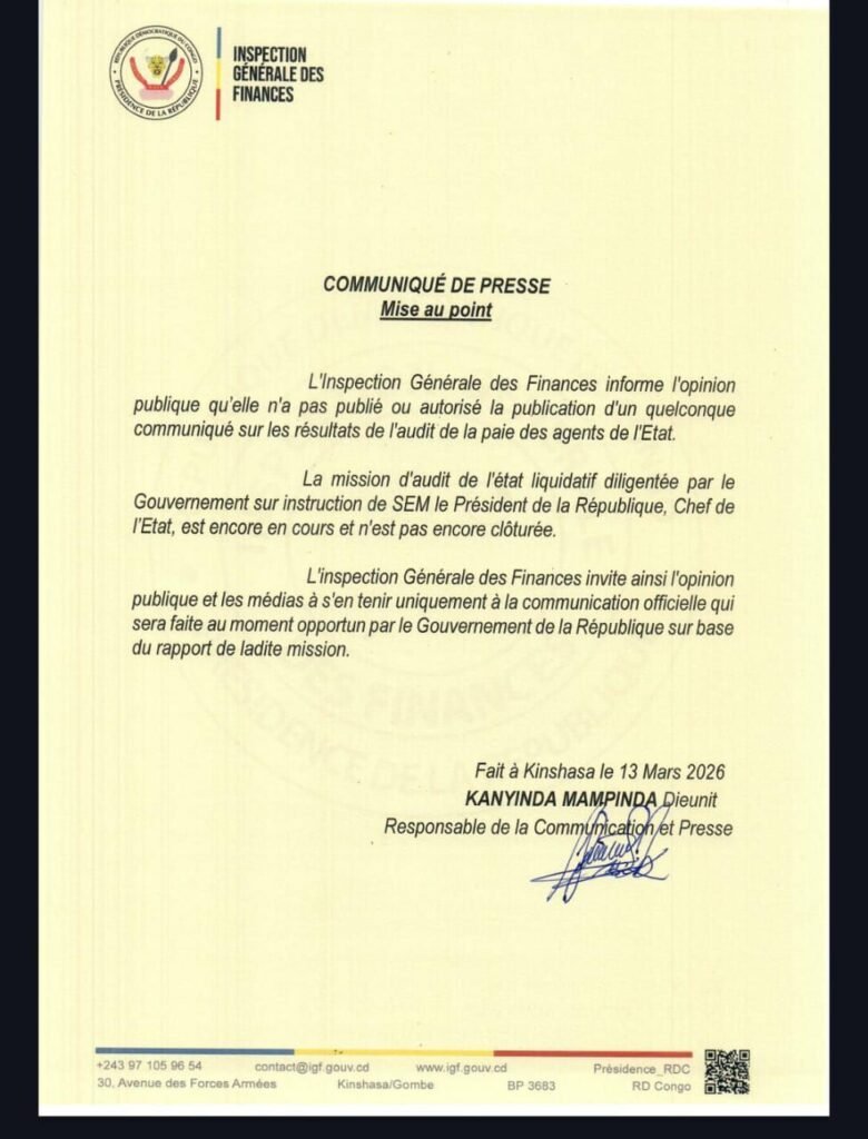 Selon l’IGF, la mission d’audit de l’état liquidatif de la paie des agents publics se poursuit normalement. Lancée par le gouvernement sur instruction du Président de la République, Félix Tshisekedi, cette opération stratégique vise à examiner avec rigueur les mécanismes de rémunération au sein de l’administration publique.