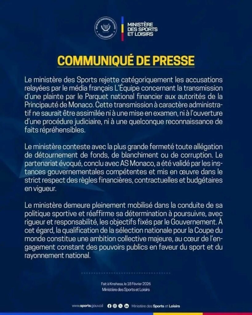 Dans un communiqué rendu public le 18 février 2026 à Kinshasa, le ministère rejette « catégoriquement » les accusations évoquant des faits présumés de détournement de fonds, de blanchiment ou de corruption liés au contrat de partenariat signé entre l’AS Monaco et la République démocratique du Congo.