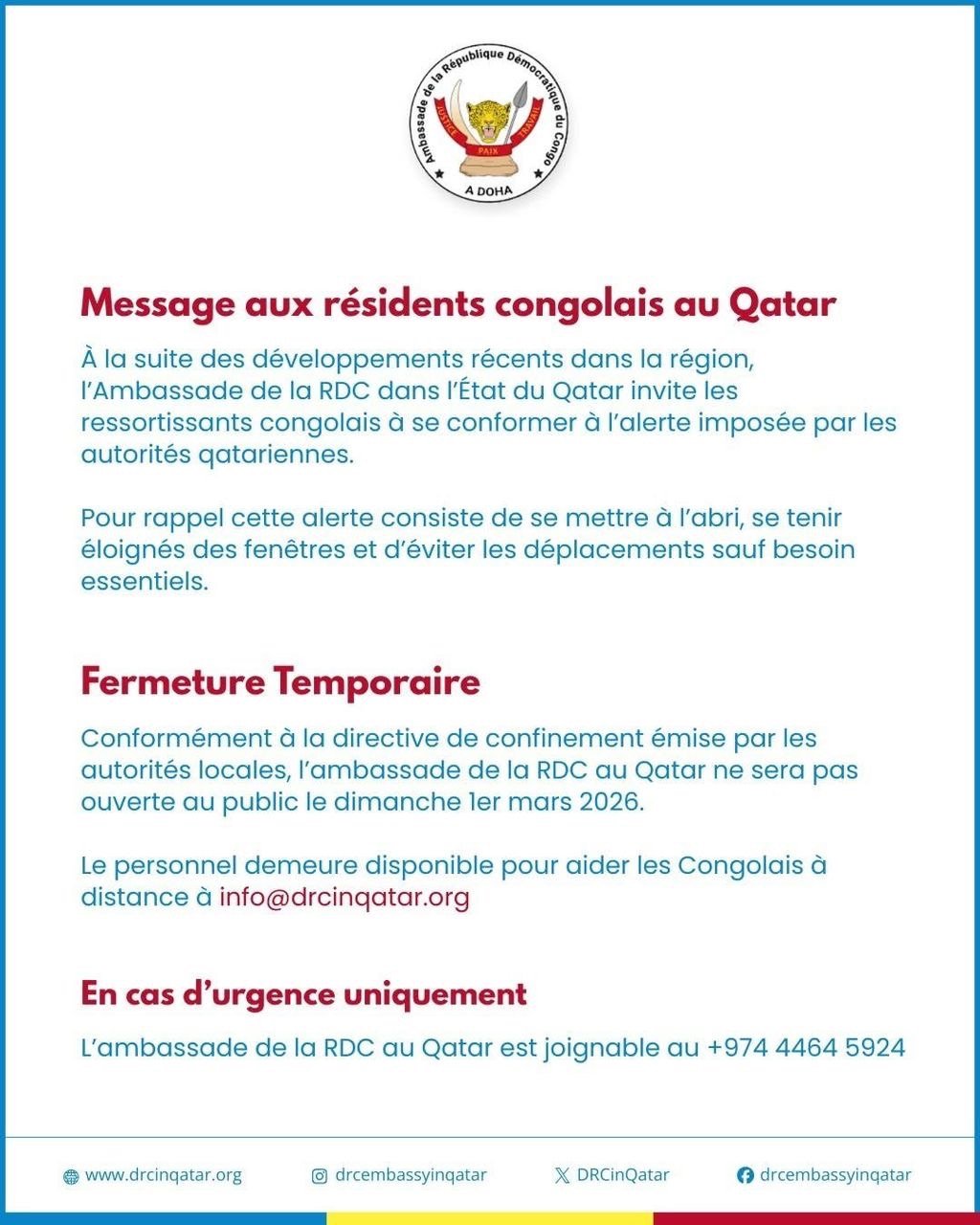 Face aux développements récents dans la région du Moyen-Orient, l’Ambassade de la République démocratique du Congo (RDC) au Qatar a adressé un message officiel à la communauté congolaise résidant dans...