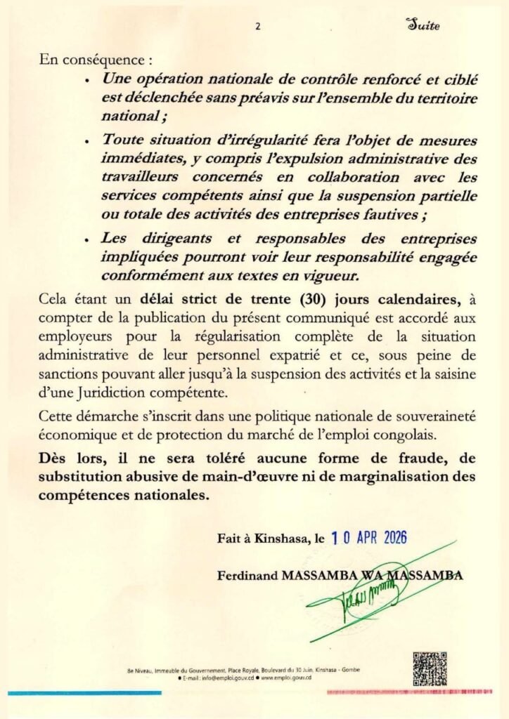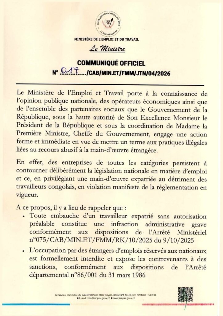 Le ministère rappelle avec insistance que toute embauche d’un travailleur expatrié sans autorisation préalable constitue une infraction administrative grave, conformément à l’arrêté ministériel n°075/CAB/MIN.ET/FMM/RK/10/2025 du 09 octobre 2025. De même, l’occupation d’emplois réservés aux nationaux par des étrangers demeure strictement interdite, sous peine de sanctions prévues par l’arrêté départemental n°86/001 du 31 mars 1986.