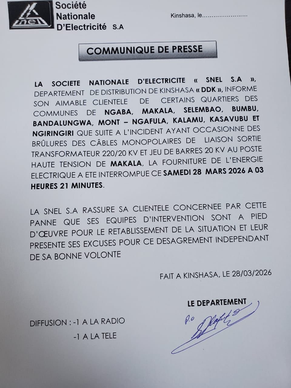 Selon la Société Nationale d’Électricité (SNEL S.A), département de distribution de Kinshasa (DDK), la panne est due à un incident survenu au poste haute tension de Makala. Les équipes techniques ont été immédiatement mobilisées pour identifier l’origine du problème et rétablir l’énergie dans les meilleurs délais.