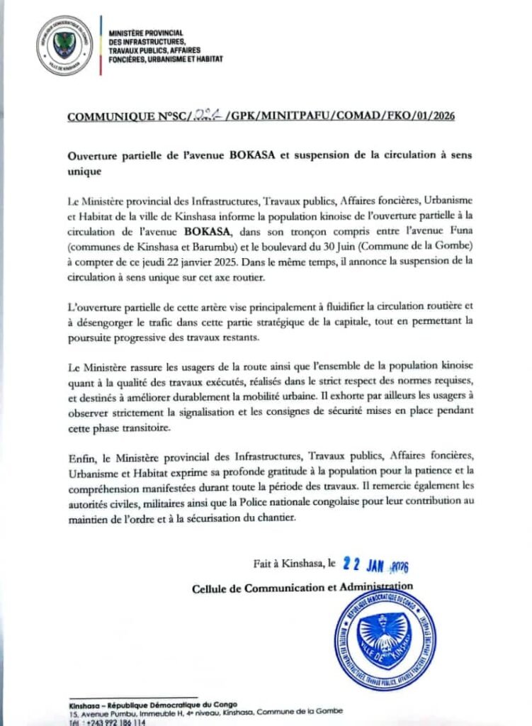 Une partie de l’avenue Bokasa, reliant l’avenue Funa au boulevard du 30 Juin, dans la commune de la Gombe, au nord de Kinshasa, a été rouverte à la circulation jeudi, selon un communiqué du ministère provincial des Infrastructures parvenu ce vendredi à notre rédaction.