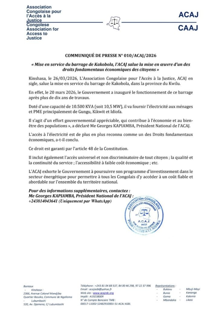 L’Association congolaise pour l’accès à la justice (ACAJ) a salué la mise en service du barrage hydroélectrique de Kakobola, situé dans la province du Kwilu. Ce projet, doté d’une capacité de 10 500 KVA (10,5 Mw), représente une avancée majeure pour l’électrification de la région. Les ménages, les petites et moyennes entreprises de Gungu, Kikwit et Idiofa devraient en tirer un bénéfice direct, grâce à un accès plus fiable et régulier à l’énergie.