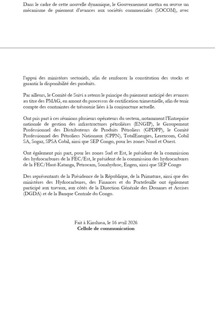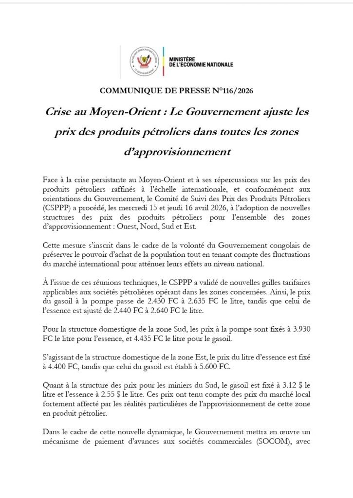 Conformément aux orientations du Gouvernement, le Comité de Suivi des Prix des Produits Pétroliers (CSPPP) a procédé, les mercredi 15 et jeudi 16 avril 2026, à l’adoption de nouvelles structures des prix des produits pétroliers pour l’ensemble des zones d’approvisionnement : Ouest, Nord, Sud et Est.