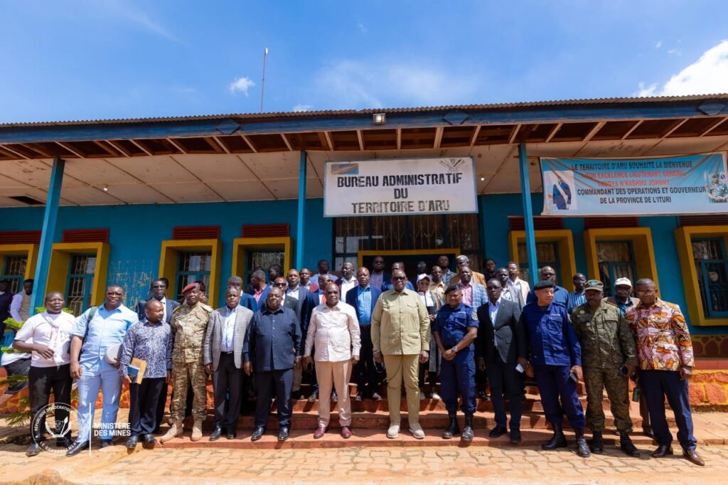 À Bunia, chef-lieu de la province de l’Ituri, le Ministre a été accueilli par les autorités provinciales avant une importante séance de travail avec le Gouverneur militaire, le Lieutenant-général Johnny Luboya Nkashama. À ses côtés, une forte délégation composée de députés nationaux, du Secrétaire général aux Mines et des responsables des structures sous tutelle, traduisant l’importance stratégique de cette mission.