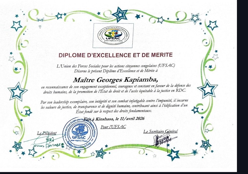 L’Union des forces sociales pour les actions citoyennes congolaises (UFSAC) a honoré, avec éclat et solennité, Georges Kapiamba en lui décernant un diplôme d’excellence et de mérite. Une reconnaissance qui vient couronner un parcours jalonné de courage et d’engagement au service de la justice en République démocratique du Congo.