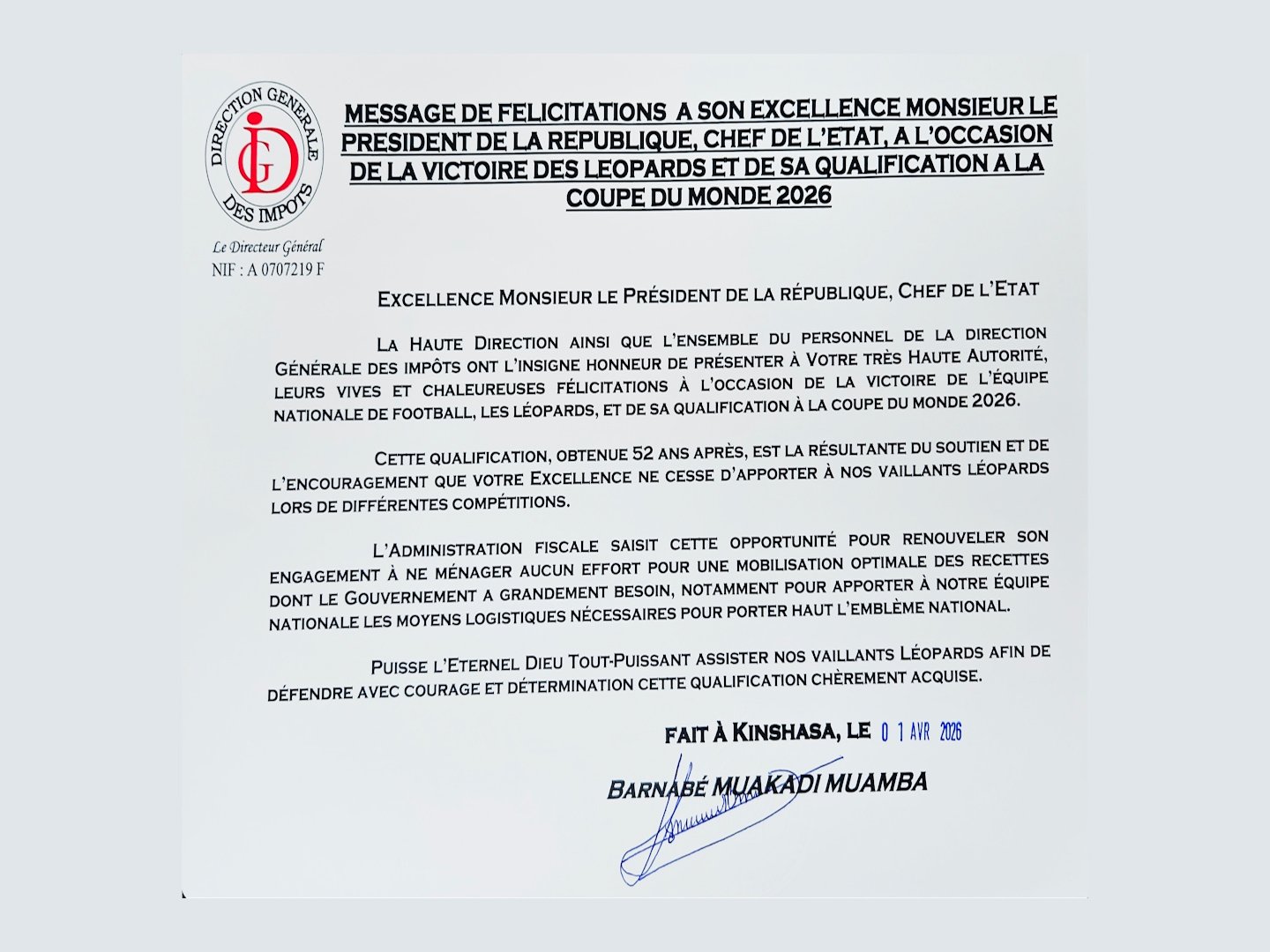 À peine l’exploit consommé, les messages de reconnaissance affluent au sommet de l’État. La Direction générale des impôts (DGI), portée par cette vague d’euphorie collective, a adressé ses vibrantes félicitations au Président de la République, Félix Tshisekedi. Dans un élan institutionnel assumé, l’administration fiscale salue un leadership dont l’engagement en faveur du sport n’a jamais faibli.