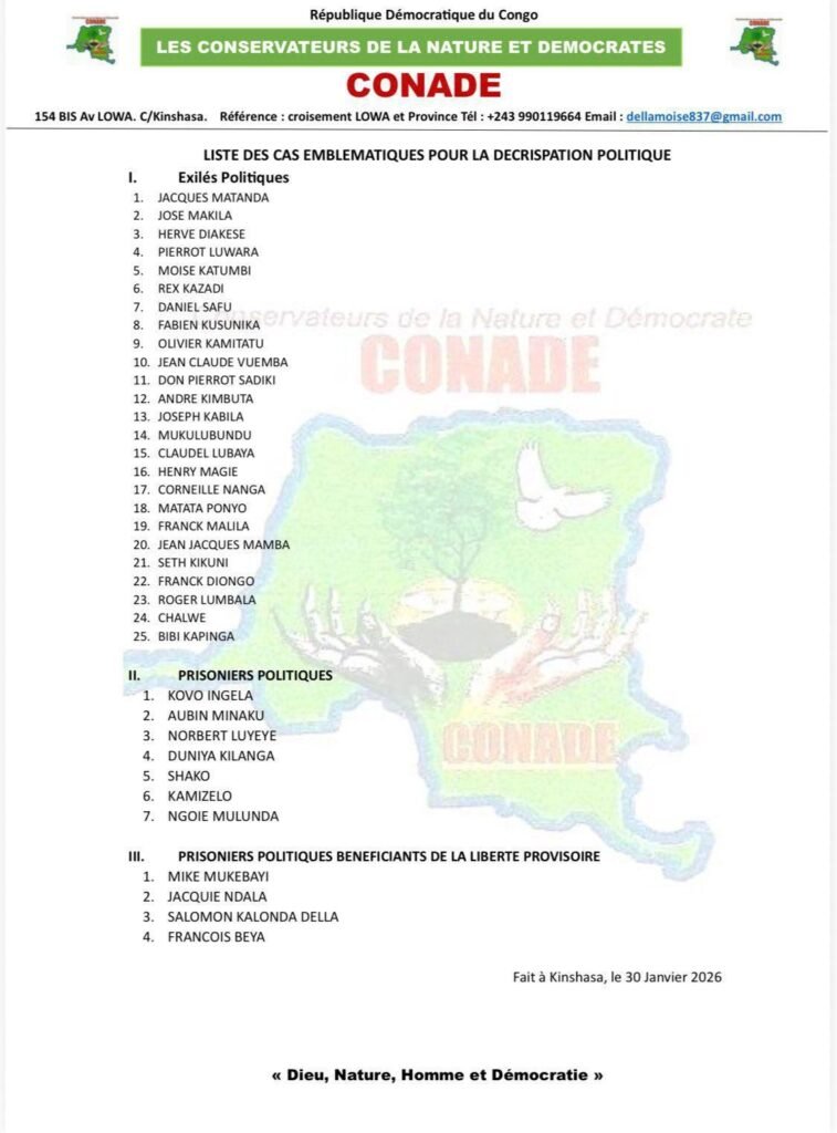 Le président du parti Conservateurs de la Nature et Démocrates (CONADE), Moïse Moni Della, a adressé une lettre ouverte au chef de l’État, Félix Tshisekedi, datée de Kinshasa le 30 janvier 2026, l’exhortant à prendre sans délai des mesures fortes pour décrisper le climat politique en République démocratique du Congo.