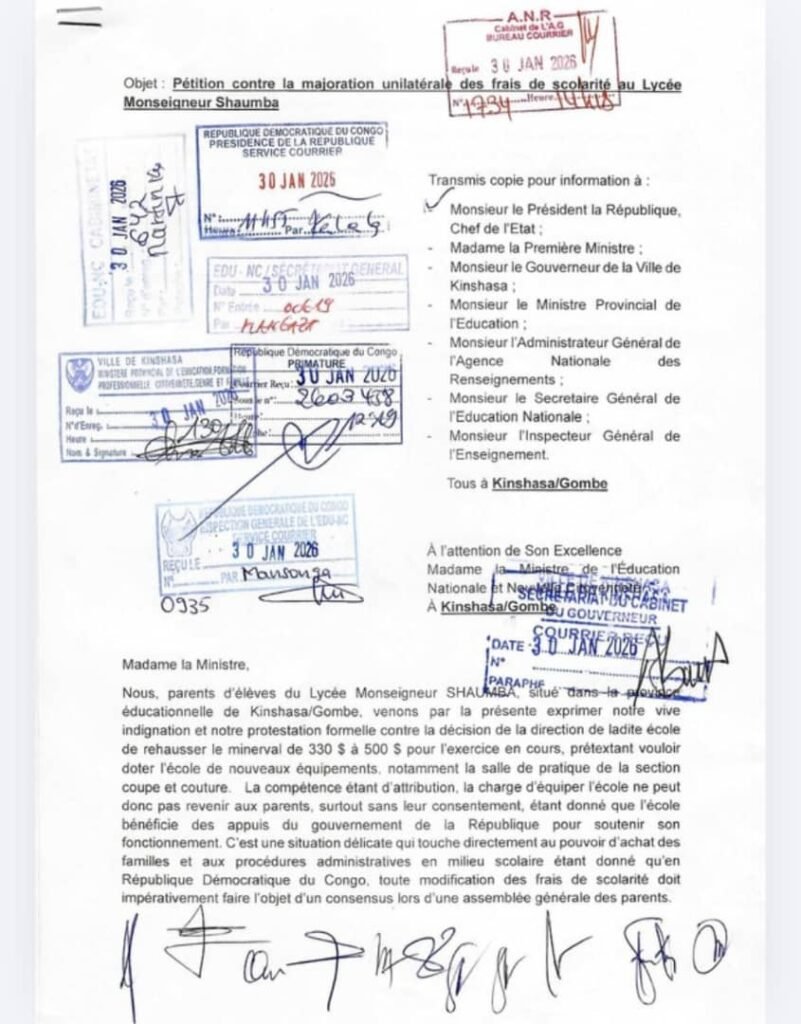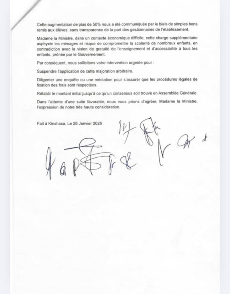 Le collectif dénonce une méthode qu’il juge contraire aux principes de bonne gouvernance scolaire. Il s’interroge notamment sur la base légale de cette augmentation, sur l’utilisation des fonds déjà perçus et sur le respect des textes réglementaires encadrant les écoles subventionnées. Les parents rappellent que le Lycée Dr Shaumba bénéficie de l’appui financier de l’État congolais, censé alléger la charge des familles.