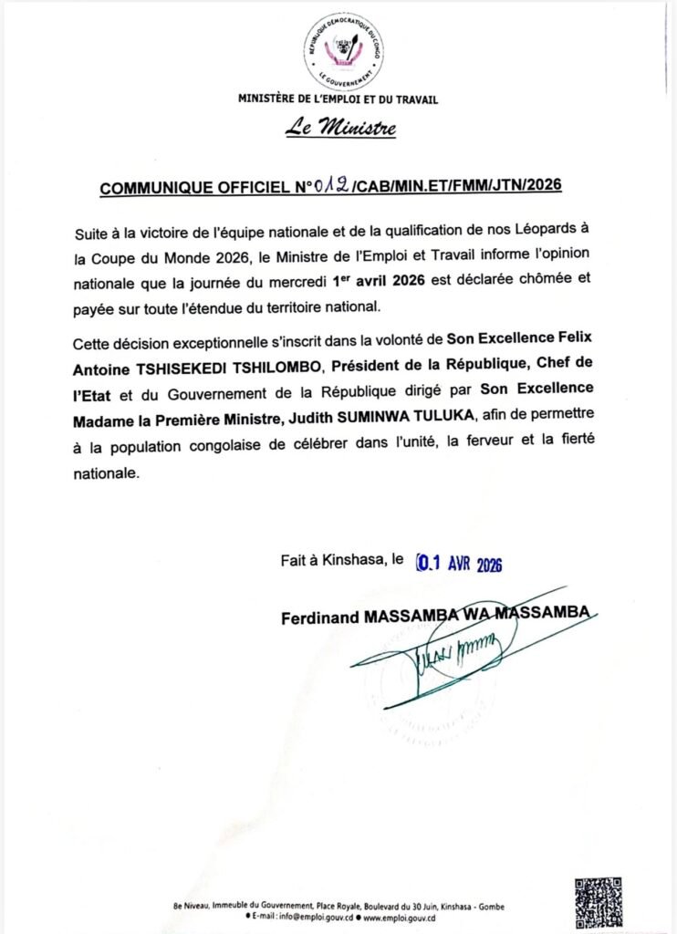 À la suite de la qualification historique de l’équipe nationale de la Léopards de la RDC à la Coupe du Monde 2026, le gouvernement de la République démocratique du Congo a officiellement décrété la journée du mercredi 1er avril 2026 comme chômée et payée sur toute l’étendue du territoire national.