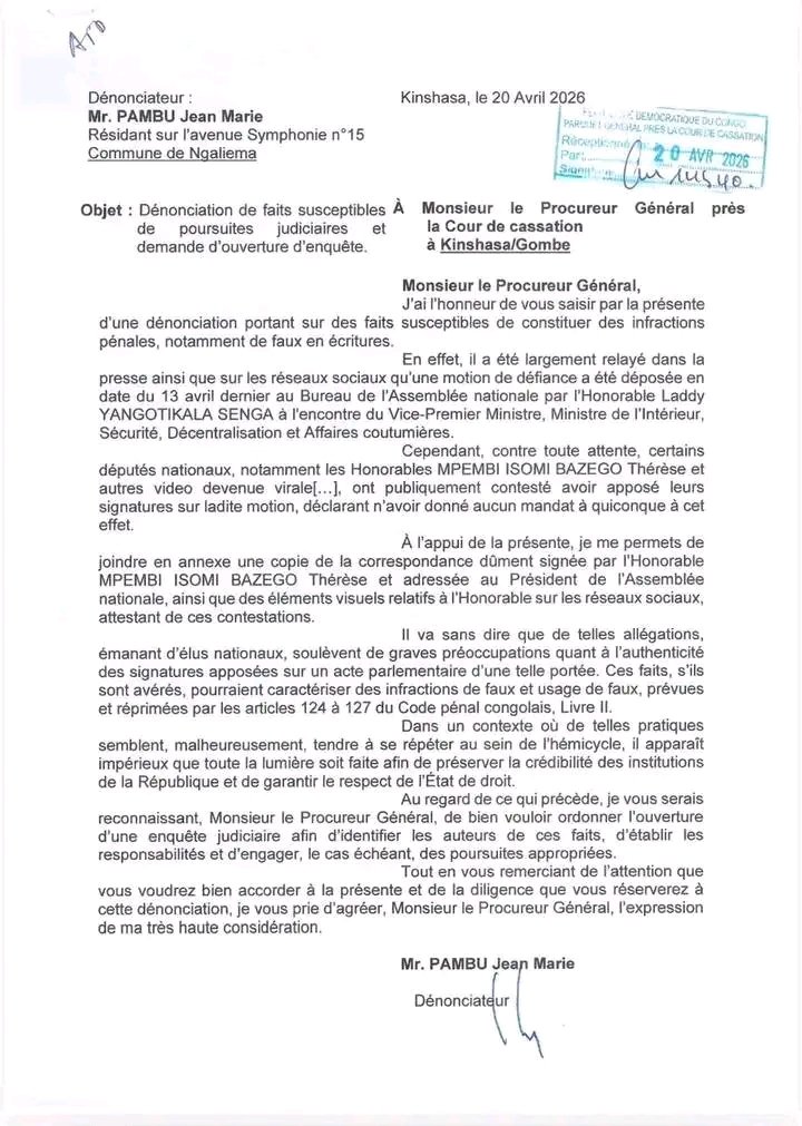 Mais au-delà de l’aspect juridique, Laddy Yangotikala dénonce ce qu’il considère comme une stratégie politique visant à affaiblir une action de contrôle parlementaire. Il estime que la controverse autour des signatures sert à déplacer le débat de fond vers des accusations de faux en écriture.