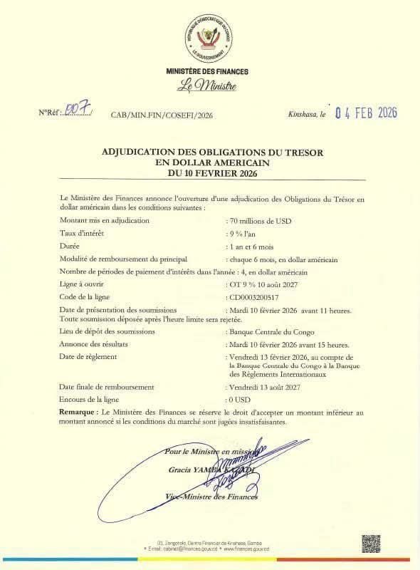 Le Ministère des Finances a récemment annoncé qu’il allait demander aux investisseurs de lui prêter 70 millions de dollars, à travers des Obligations du Trésor en dollar américain, avec un taux d’intérêt de 9 % sur un an et demi. Cette opération, prévue pour le 10 février 2026, se fait dans le cadre d’un mécanisme légal de mobilisation de liquidités auprès des banques et des opérateurs économiques, organisé par la Banque Centrale du Congo.