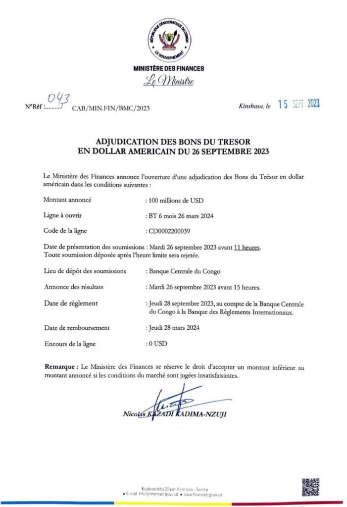 Cette pratique n’est pas nouvelle. Déjà sous l’ancien ministre des Finances Nicolas Kazadi, un document officiel daté du 15 septembre 2023 annonçait une adjudication des Bons du Trésor en dollar américain pour un montant de 100 millions USD. Les offres devaient être déposées le 26 septembre 2023, et le remboursement était prévu pour le 28 mars 2024. Là encore, l’État demandait simplement aux investisseurs de lui prêter de l’argent pour une période déterminée.