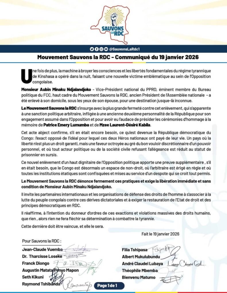 Selon Sauvons la RDC, cette interpellation serait directement liée à l’engagement assumé d’Aubin Minaku dans l’opposition ainsi qu’à son rôle dans la présidence des cérémonies d’hommages à la mémoire de Patrice-Emery Lumumba et de Laurent-Désiré Kabila. Le mouvement estime que cet acte vise à intimider toute voix dissidente et à criminaliser l’expression politique pluraliste.