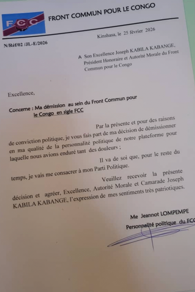Coup de tonnerre sur la scène politique congolaise. Maître Jeannot Lompempe a officiellement quitté le Front commun pour le Congo (FCC), la plateforme politique dirigée par son Autorité morale, l’ancien Président de la République Joseph Kabila. L’annonce a été faite à travers une correspondance adressée directement à la hiérarchie de la coalition.